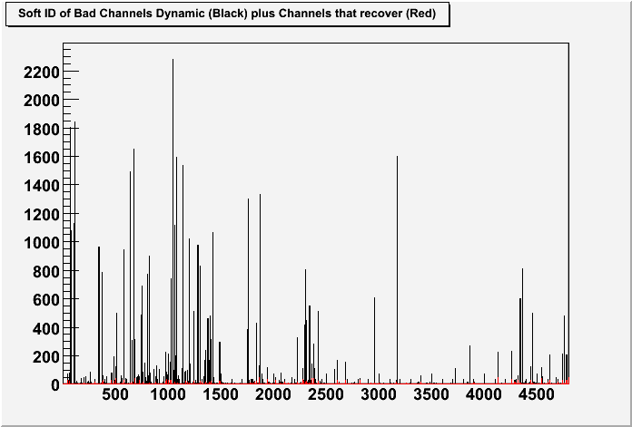 This plot shows all the channels that went bad, which may show a hardware problem, or may just be high gain.The redline is the ones that recovered superimposed, so you can see how rare that was